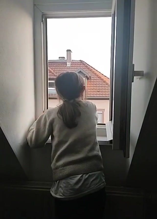 A young person stands at an open window in what appears to be a stairwell. The child faces away from the camera and looks out the window. They are wearing a light-colored sweater over what appears to be a longer white shirt and dark pants. Their hair is pulled back in a low ponytail. Through the window is a view of a house with a terracotta roof and chimney. The walls around the window are painted white. The area where the camera is positioned is darker. The child calls out, "Eh oh les gens! Les gens!" which translates to "Hey oh people! People!" in English.