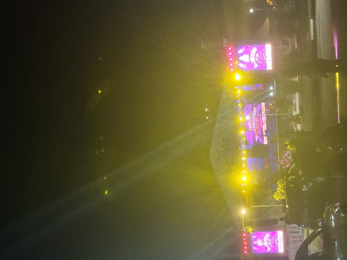 A nighttime scene features a brightly lit stage with digital screens displaying colorful images and text, possibly an event or concert. The area surrounding the stage is illuminated by numerous stage lights, creating a vibrant and energetic atmosphere. In the foreground, vehicles and figures are visible, suggesting the presence of an audience or attendees. The overall impression is one of a lively outdoor gathering or performance taking place after dark.