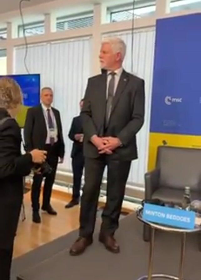 Petr Pavel, the President of the Czech Republic, standing on a small stage at what appears to be a conference or formal event. He is wearing a dark suit and stands with his hands clasped in front of him. A woman with a camera stands to his left and appears to be speaking to him. Behind them are two men in suits, possibly security or staff. A small side table with a nameplate that reads "Minton Beddoes" stands to his right. The background includes large windows with blinds, event banners and informational screens.