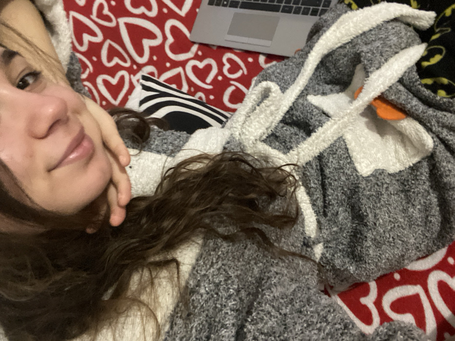 A close-up, angled photograph depicts an individual in an indoor setting in Bouxwiller, France. The subject, a female, is positioned with her upper torso and head visible, looking towards the camera. She possesses long, wavy, dark brown hair. Her right hand is positioned under her chin, fingers curled. She is wearing a grey, textured, fluffy garment, possibly a hooded top, which features prominent white fluffy drawstrings and a white, stylized animal applique with an orange element on the front. Behind her head and to her right, a red fabric with multiple white heart patterns is visible. A black and white striped pillow or cushion is partially visible behind her left shoulder. To the right of the frame, a silver-colored laptop with a dark screen and visible keyboard rests on the red heart-patterned fabric. A dark fabric with yellow Batman logo patterns is partially visible in the lower right corner.