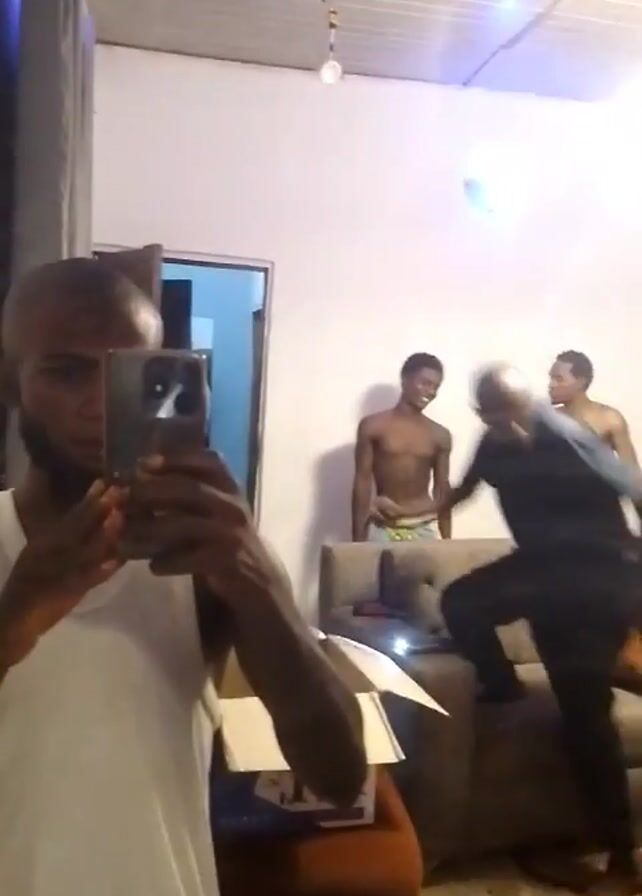 A person is filming themself in what appears to be a mirror, with a smartphone. In the reflection, there are three other individuals in the background. Two of the individuals are shirtless, and another one is walking across the back of a couch. The room has white walls, a ceiling light, and a few pieces of furniture. There is also a partially visible doorframe.
