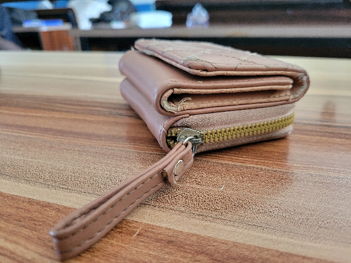 - "A well-worn, pinkish-brown (nude-toned) bifold or trifold wallet, possibly made of synthetic leather, rests on a polished wooden surface" by FM-g6YQ23, licensed under CC BY 4.0