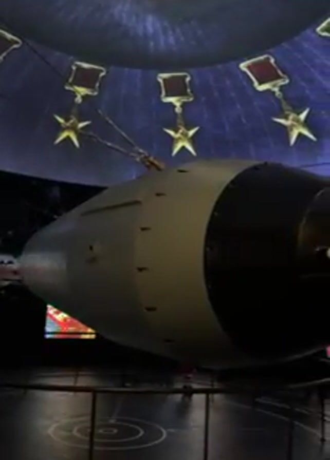 large, gray and black object resembling a warhead or bomb suspended in a dimly lit room. The room has a circular floor with concentric rings painted on it and a circular ceiling displaying a projection that changes from a view of space with hanging decorations to a fiery explosion. The object is suspended by cables from the ceiling. A person is briefly visible in the lower left corner of the frame. The video pans around the object.