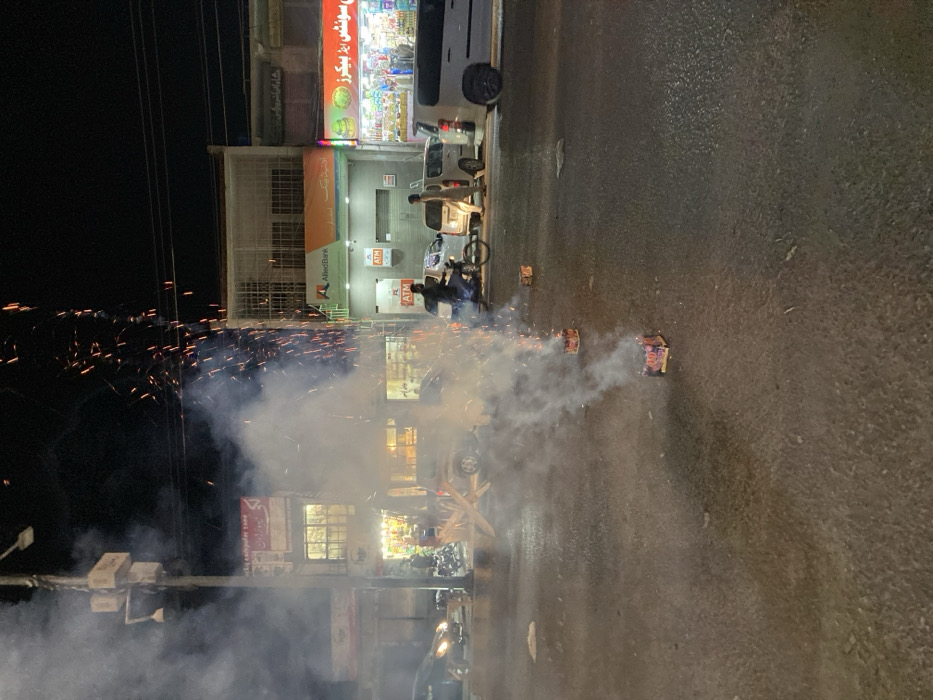 The image depicts an nighttime street scene in Qilla Saifullah, Pakistan, characterized by active firework displays