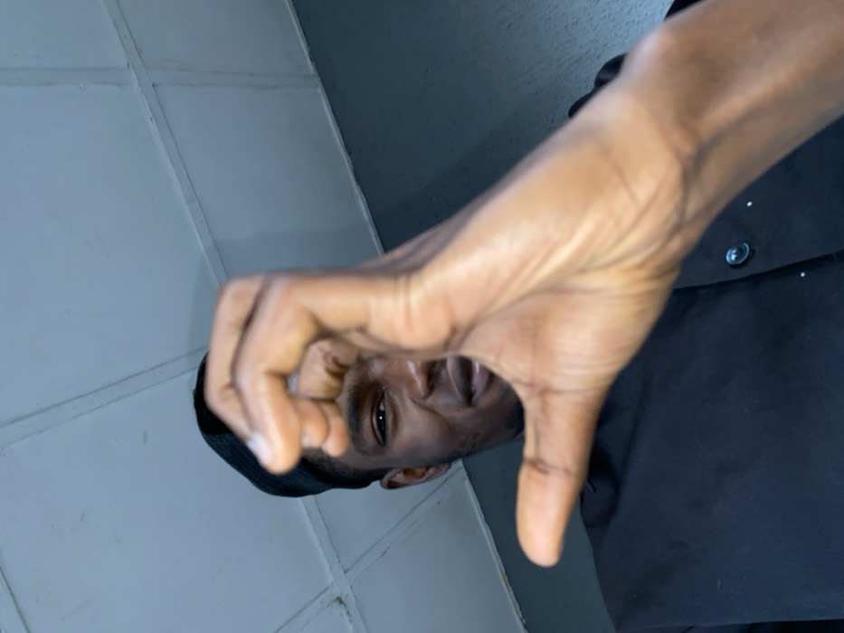 The image captures an indoor scene featuring a young adult male. He has dark skin and is depicted from the chest up, looking directly at the viewer with a slight smirk or smile. He wears a dark, possibly black, cap and a matching dark shirt with buttons visible on the right side of the chest. His right hand is prominently in the foreground, raised towards the camera, with fingers curled to form a "C" shape. This hand partially obscures the right side of his face. The background consists of a light-colored ceiling with visible paneling or structural lines, and a darker, plain wall beneath it. The lighting is even, indicating an interior environment. While no specific geographical markers are present in the image, the depicted location is understood to be within the city of Udu, Nigeria.
