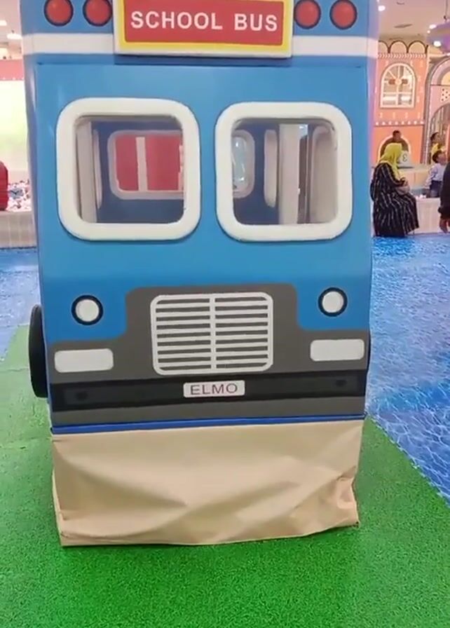n indoor playground. In the foreground is a blue toy school bus with "ELMO" written on the front. The playground has a blue floor with a wave pattern and various play structures. Children and adults are scattered throughout the playground, interacting with the different play features. A woman in a hijab is visible among the crowd. The area is brightly lit with overhead lights.