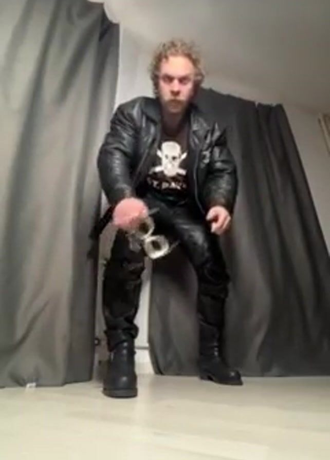 A man stands in front of a set of gray curtains wearing all black leather clothing. He has a black leather jacket over a brown t-shirt with a skull and crossbones design. He also wears black leather pants and boots. He has frizzy, curly hair and a mustache. He squats and puts on a pair of round, white-rimmed sunglasses. He then raises one leg and poses.