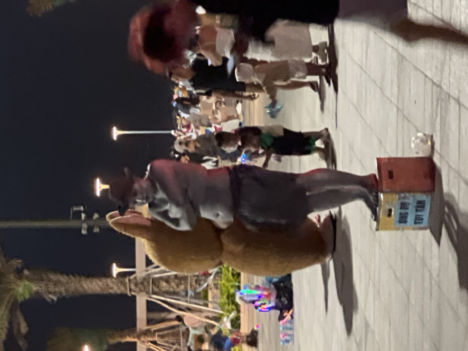 The image depicts a nighttime scene in a busy outdoor pedestrian area in Ho Chi Minh City, Vietnam. In the central foreground, a male street performer, painted entirely silver or grey, stands barefoot on a multi-colored crate. He wears dark shorts and a dark fedora-style hat, with his arms crossed over his bare chest. A reddish light illuminates his left side. The crate beneath him features Vietnamese text, "ỦNG HỘ TÙY TÂM," indicating a donation request. Immediately behind and to the left of this performer is a second individual inside a large, brown, furry mascot costume, visible from the back with prominent ears. To the left, a vendor or another performer is seated on the ground, surrounded by an array of brightly glowing, multi-colored light-up toys. Several children are present in the mid-ground: one young child in a green shirt holds a light-up toy, looking towards the silver performer, while another very young child in light-colored clothing also holds a light-up toy to the performer's right. The ground is a light-colored paved surface. In the background, numerous individuals, including adults and children, populate the area, suggesting a bustling public gathering. Tall palm trees with illuminated trunks are visible on the left side, and modern-style streetlights with distinct T-shaped illumination patterns are scattered throughout the background, providing ambient light under a dark night sky.