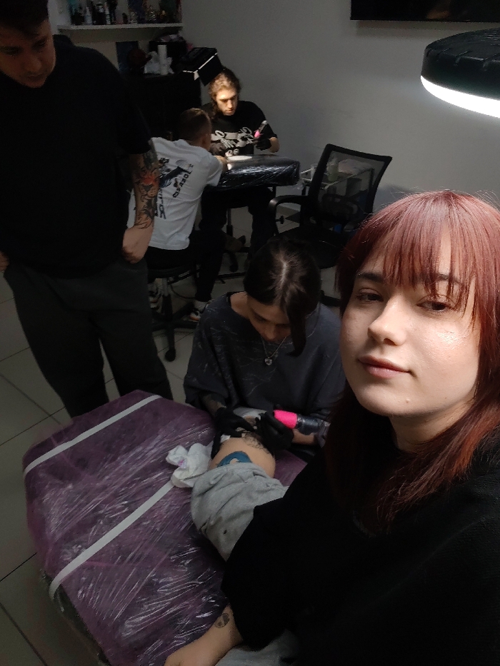 The image depicts an indoor scene within a tattoo studio located in Rostov-on-Don, Russia