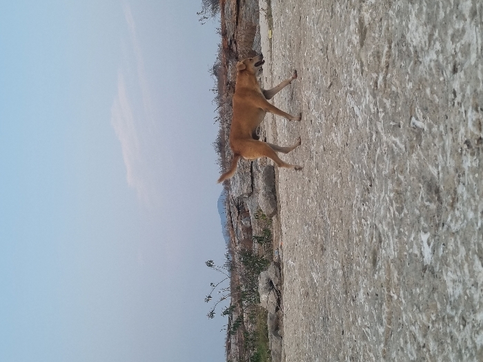 - "A light brown, short-haired canine walks from right to left across an irregular, light grey ground surface, appearing to be dry earth or concrete with white mineral deposits" by FM-Qmj6l1, licensed under CC BY 4.0