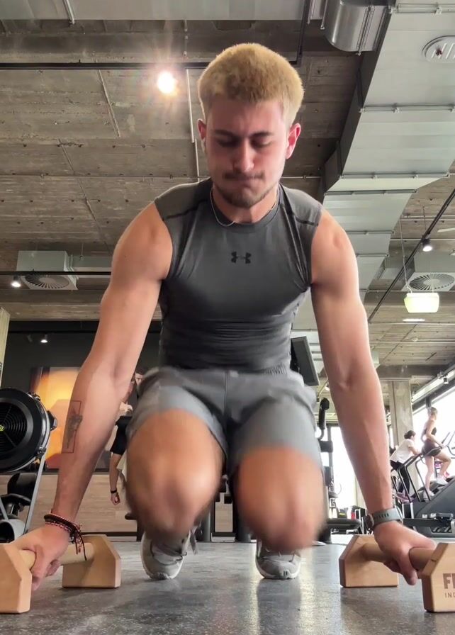 A young man is performing a handstand at the gym. He's wearing a gray tank top, gray shorts, and white athletic shoes. His hair is blond and short. He's using wooden push-up bars for support. In the background, other people are exercising on various machines. The gym has a modern, industrial design with exposed pipes and concrete ceilings. There's a rowing machine and other fitness equipment visible. The floor is a patterned gray.
