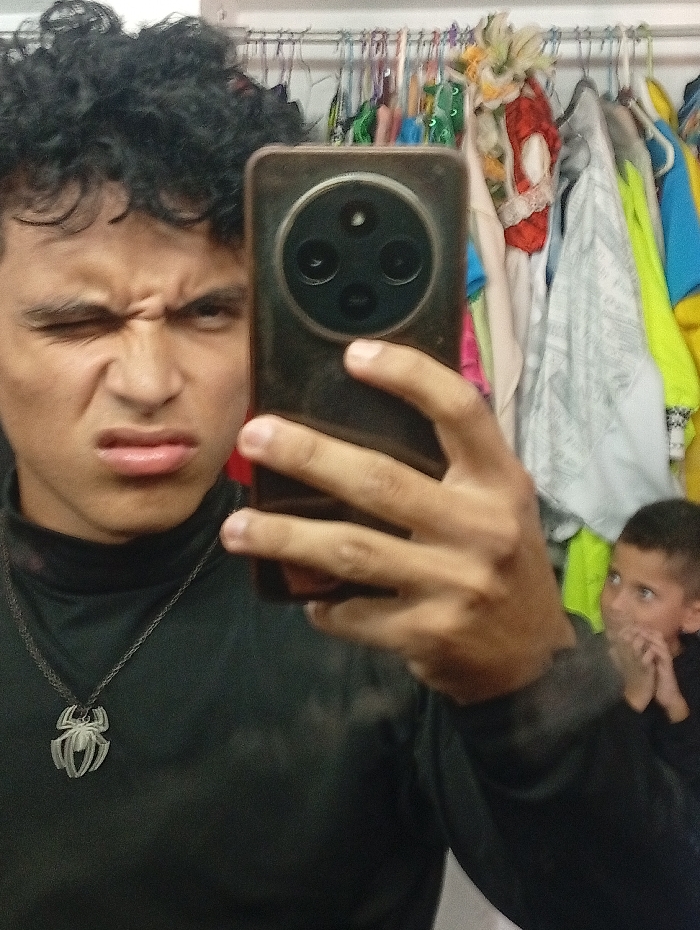 A person with curly hair takes a selfie with a cell phone, winking and scrunching their face. They wear a black shirt and a spider-shaped pendant. Behind them is a rack of clothes and another child with a curious expression. The phone's camera has a distinctive three-lens design.