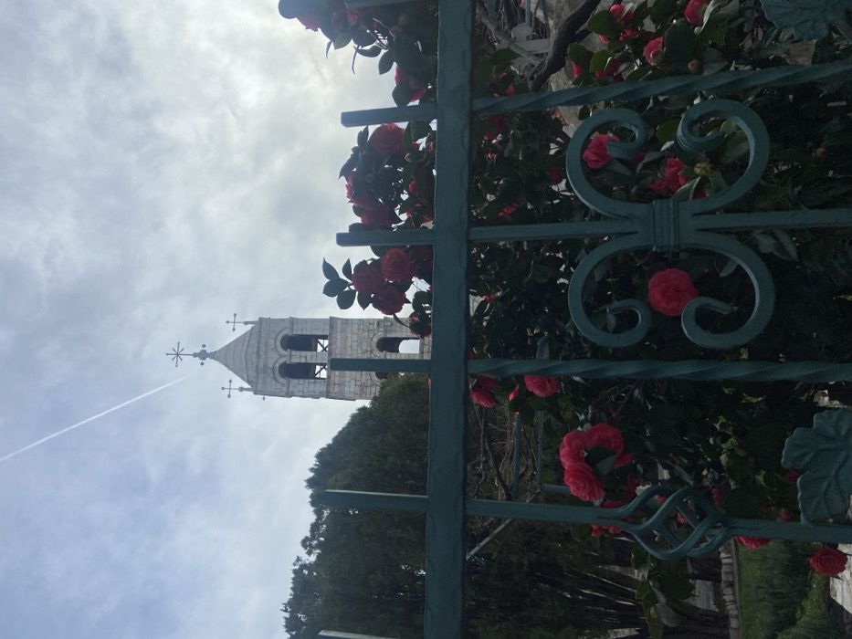 A wrought-iron gate painted green frames a picturesque view. Red roses cascade over the gate and lush greenery. In the background, a light gray stone bell tower rises, topped with a cross against a cloudy sky. A faint contrail cuts across the sky near the tower. The composition focuses on the foreground details of the gate and roses, with the tower as a secondary focal point.