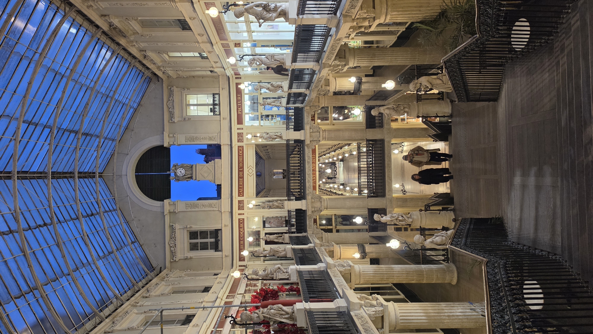 The image displays the multi-level interior of the Passage Pommeraye, a historic covered shopping arcade located in Nantes, France. The perspective is from an upper floor, looking down a wide, ornate central staircase. Above, a curved, paneled glass roof allows a view of a clear blue sky, suggesting either dusk or dawn. The architecture is characterized by cream-colored walls, classical fluted columns, pilasters, and decorative moldings, extending across three visible levels of galleries. Each level features black wrought-iron railings. Numerous classical statues, typically nude or robed figures, stand on pedestals along the balconies. Spherical light fixtures are suspended or mounted throughout the passage, providing warm illumination. Storefronts line the galleries, with visible signs including "ATELIER COOLICO," "GALERIE DE L'HORLOGE," "PARTIMERIE," and "PICTURE." Within an archway at the highest visible point, a prominent clock, flanked by classical figures, partially reveals an exterior building beyond. In the midground, two individuals are descending the central staircase. The person on the left wears a dark coat, while the person on the right wears a light-colored trench coat, a scarf, and a hat. Indistinct figures are also visible on the lower levels. Red decorative elements are visible inside a shop window on the second level to the left, and green foliage is situated near the base of the staircase on the right.