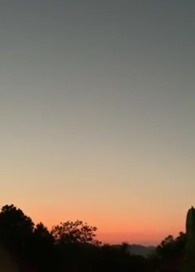 scenic evening view. A thin crescent moon is visible high in the sky against a light blue to grey gradient backdrop. Below the sky, the horizon is marked by a transition to orange and pink hues, suggesting a sunset or twilight. The foreground is dominated by silhouettes of trees and what appears to be a roof line of a building.
