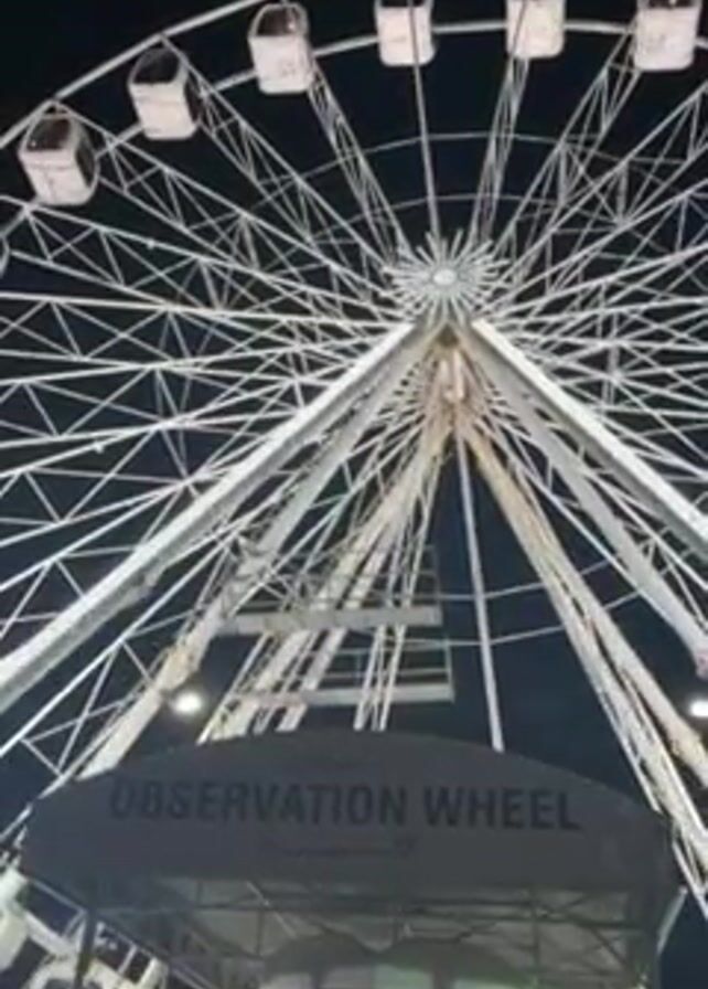 A low-angle shot shows a large, white, illuminated Ferris wheel at night