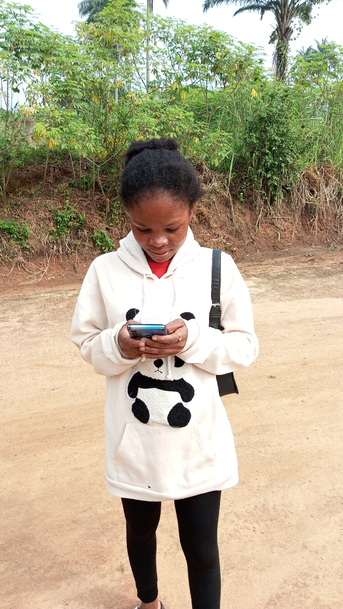 An individual, identified as a young adult female, stands outdoors on light brown, unpaved earth in Agburu Uke, Nigeria. She wears a beige hooded sweatshirt featuring a black and white panda design on the front, a red garment visible beneath the neckline, and black leggings. A black shoulder bag is positioned on her left side. She holds a dark mobile phone in both hands, directing her gaze towards its illuminated screen. A ring is present on her left ring finger. The background consists of dense green vegetation, including shrubs and small trees, with taller palm trees visible against a bright, overcast sky.