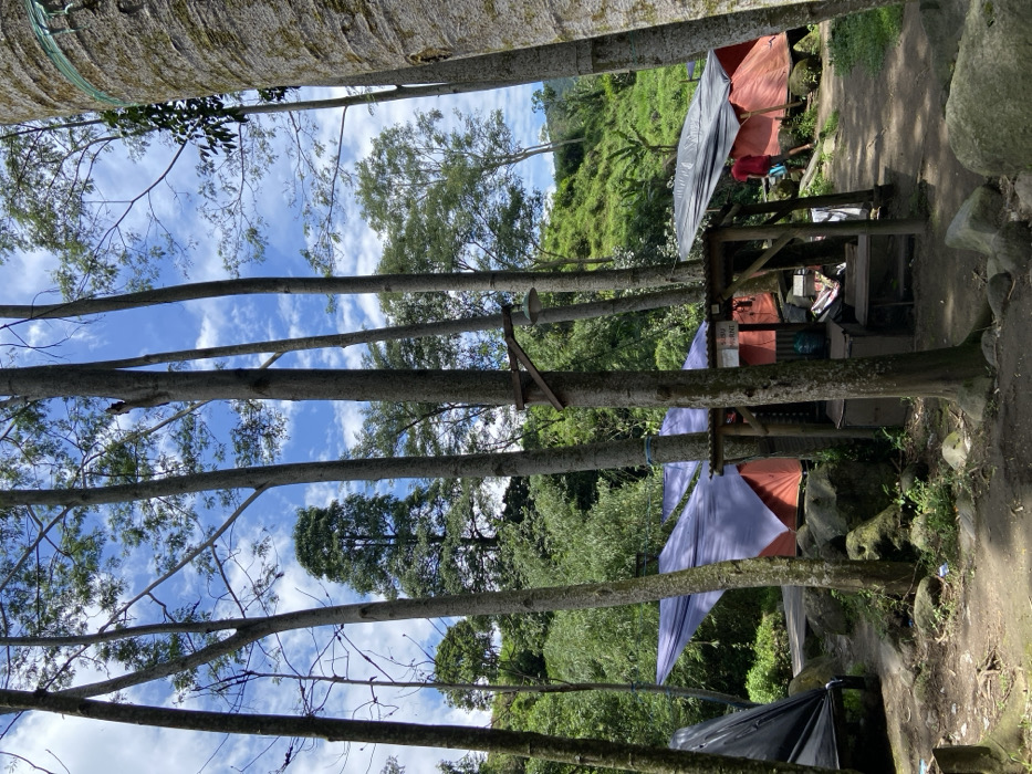 A perspective view upwards through a canopy of tall, slender trees reveals a partly cloudy sky. The trees are interspersed with shelters or stalls constructed from wood and tarps, suggesting a marketplace or camp in a forest setting. Lush green vegetation fills the background, creating a natural and rustic ambiance. The image has a natural, untouched feel.