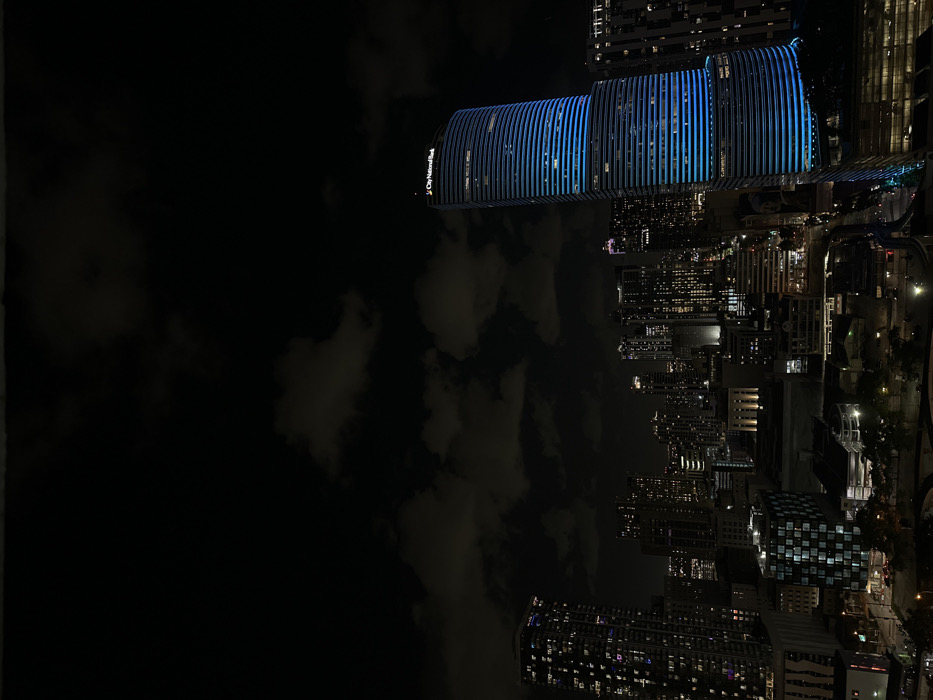 The image displays a nighttime panoramic view of the Brickell financial district in Miami, Florida, United States. The central focus is a prominent skyscraper on the right, identifiable as the 1450 Brickell building, which features distinct blue horizontal LED lighting along its facade and "City National Bank" signage illuminated at its apex. The dark sky above is partially obscured by scattered, dimly visible clouds. To the left and throughout the midground, a dense cluster of numerous other high-rise buildings, both residential and commercial, rise into the frame, their windows exhibiting varying patterns of internal illumination. At the bottom of the image, portions of illuminated city streets, infrastructure, and lower-level buildings are visible, suggesting an active urban environment. No discernible individuals or specific actions are identifiable within the frame.