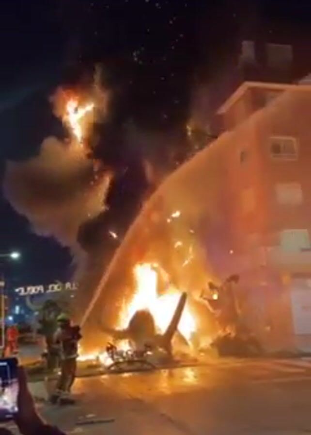 At night, a massive fire burns in a city street. Flames reach high into the air, producing smoke and sparks. A firefighter sprays water on the fire with a hose. Buildings are visible in the background. A person is recording the scene on a mobile phone.