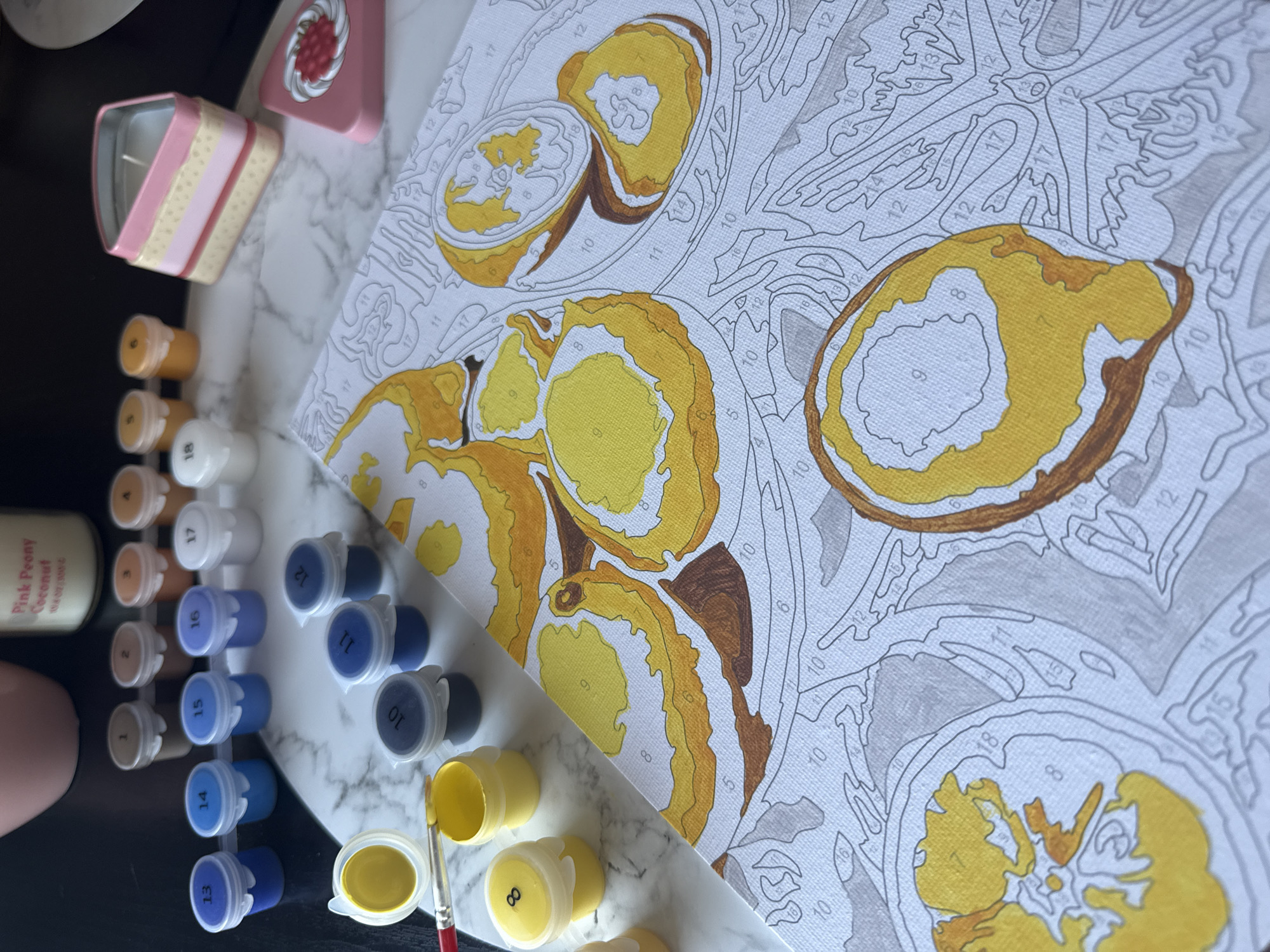 close-up of a paint-by-numbers project in progress. The subject appears to be a painting of citrus fruits, with partially completed areas colored in yellow and brown hues. Paint pots labeled with numbers, ranging from 1 to 18, sit on a marbled surface, along with a paintbrush. Two decorative tins, one shaped like a layered cake and the other like a slice of cake, are visible in the upper left corner. A bottle labeled "Pink Peony Coconut" is also present.