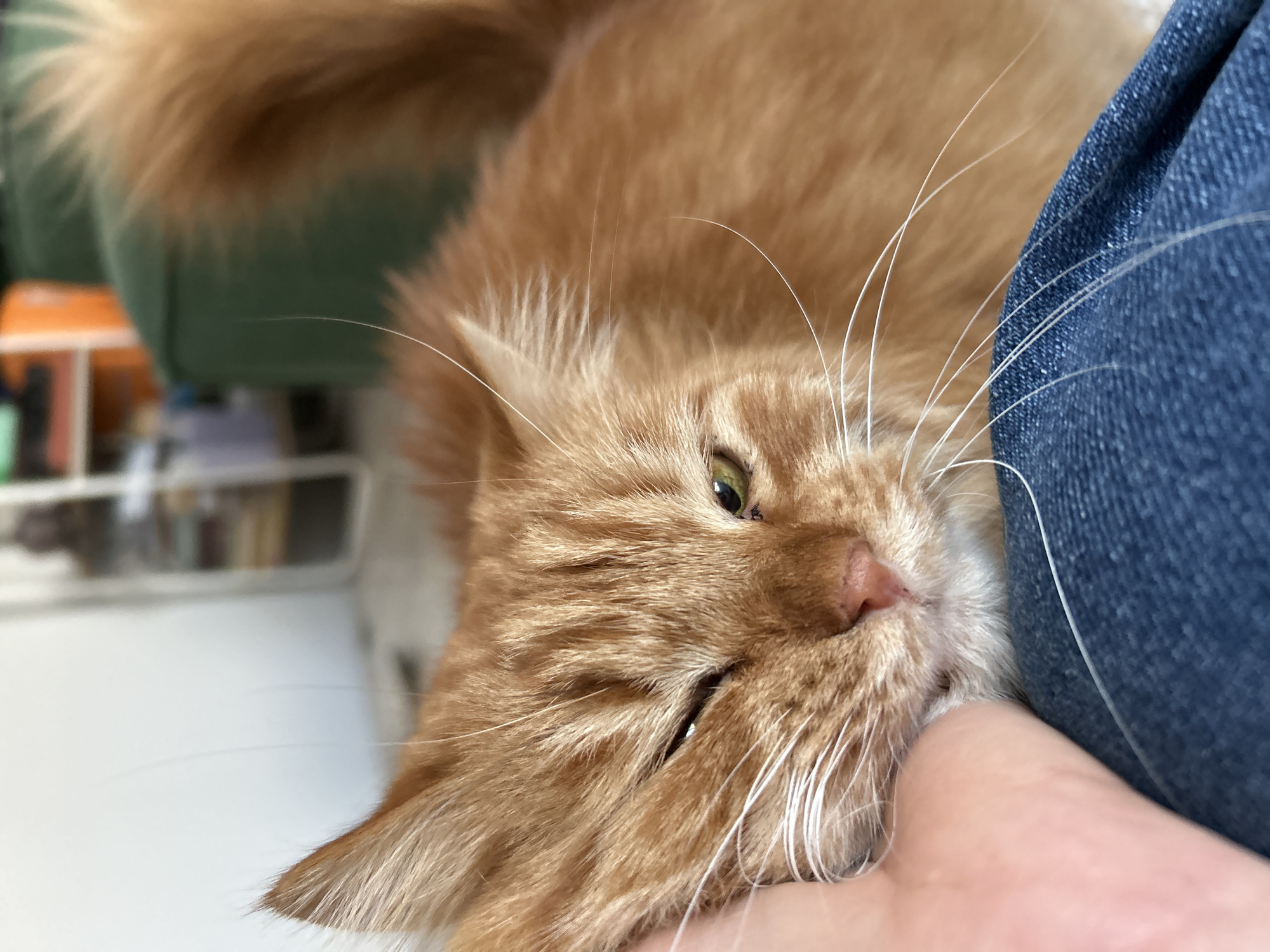 In an indoor domestic setting in Chaikovsky, Russia, a close-up, eye-level perspective captures an interaction between a domestic ginger cat and a human. The cat, displaying long orange fur and prominent white whiskers, occupies the foreground. Its right eye is partially closed in a squinted manner, while its left eye is open. The cat's left cheek is pressed against a human's bare right hand, specifically a thumb and index finger area, indicating physical contact or petting. The cat's lower body and chest rest upon dark blue denim fabric, consistent with a human's lap or leg clad in jeans. The background is intentionally blurred, revealing indistinct shapes suggestive of interior furnishings, including a white wall segment to the upper left and faint outlines of a dark green upholstered object and an orange rectangular item to the upper right.