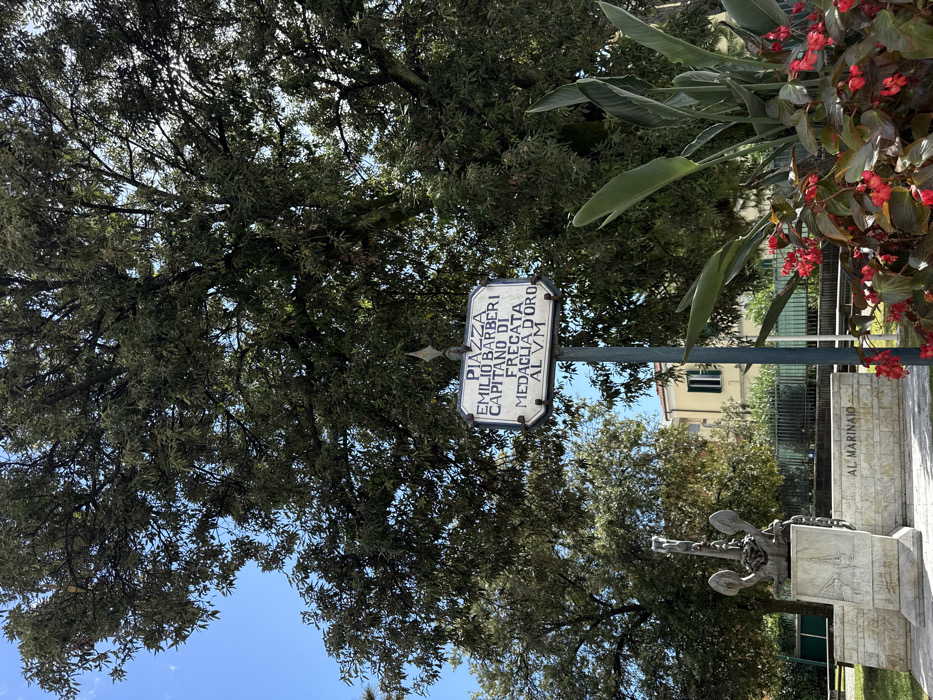 The image displays a public square in Forte dei Marmi, Italy, under a clear blue sky. Dominating the frame are large, dense green trees. A white, rectangular street sign with a blue border and black lettering is centrally positioned, mounted on a teal-colored pole topped with a decorative finial. The sign reads: "PIAZZA EMILIO BARBERI CAPITANO DI FREGATA MEDAGLIA D'ORO AL V.M." To the lower left of the sign, a stone monument is visible. It consists of a light-colored, multi-tiered stone base, featuring a relief of a ship and the inscription "AL MARINAIO" (To the Sailor). An anchor with chains, crafted from a dark metal, is prominently positioned atop the base. The foreground includes vibrant red flowering plants with dark green leaves and larger, broad-leafed green plants. In the background, behind the monument, a light-colored building with yellow window frames and a dark fence is partially visible. No individuals are present in the scene.