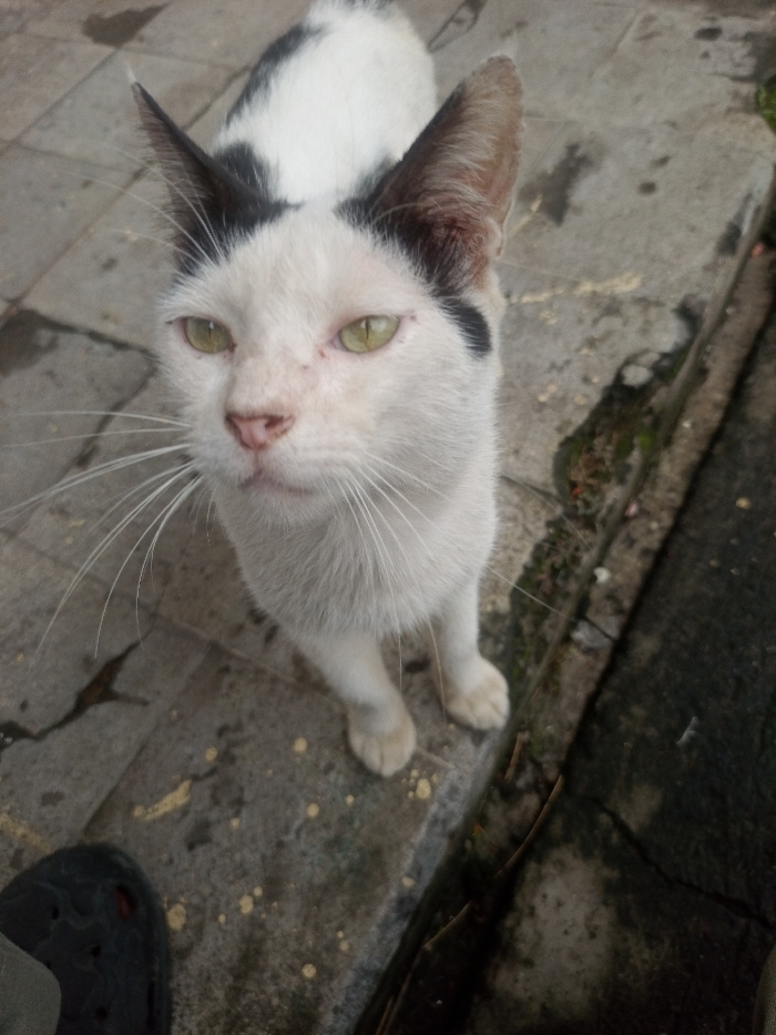 - "A bicolored domestic cat (white with black head and dorsal markings) is depicted standing on a wet, light-grey concrete paved surface" by FM-Jri2t1, licensed under CC BY 4.0
