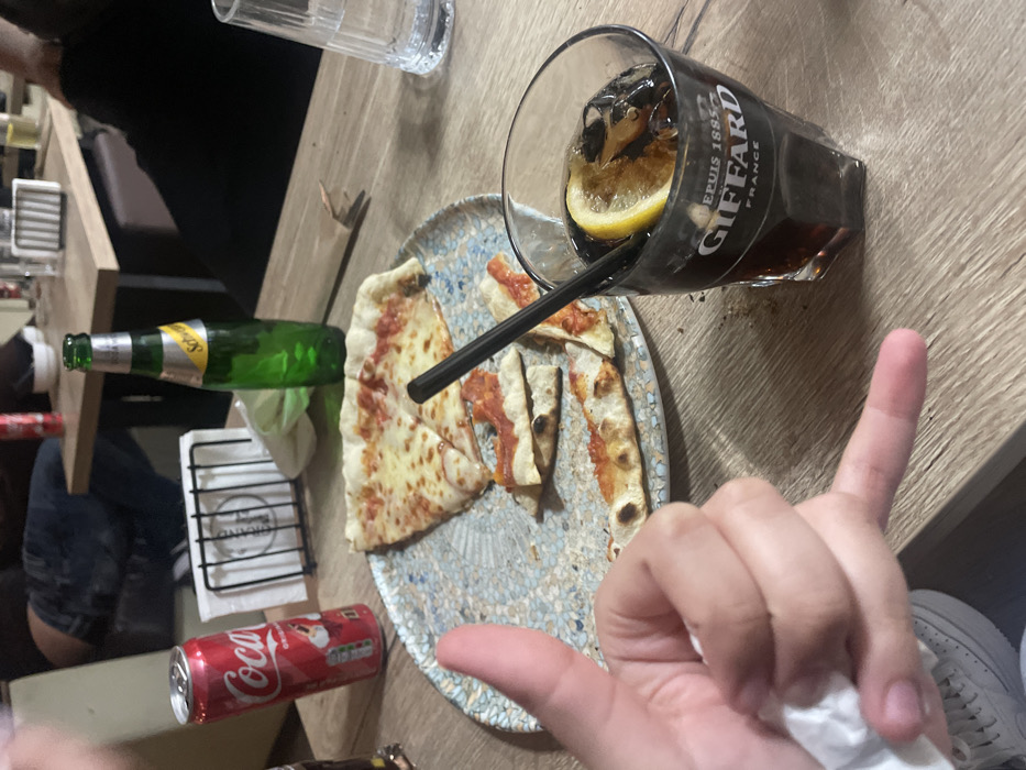 This image depicts a tabletop scene within a restaurant or cafe in Velingrad, Bulgaria. In the lower-left foreground, a human hand, likely belonging to the person capturing the image, performs a gesture with the thumb and pinky finger extended, while the index, middle, and ring fingers are curled inward. A crumpled white tissue or napkin is held within the palm. Part of a white sneaker with visible lacing is also in the lower-left corner. Centered on the table is a round plate with a blue and white speckled pattern, holding remnants of a consumed pizza. One large slice of cheese pizza remains mostly intact. Below it, several smaller, irregularly shaped pieces of pizza crust and partially consumed portions are scattered on the plate. A black straw lies across the plate. To the right of the plate, a clear, faceted glass contains a dark brown beverage with ice cubes and a yellow lemon slice. The glass is branded "GIFFARD FRANCE". Further into the background on the left, a red Coca-Cola can stands upright. Adjacent to it, a black metal napkin holder contains white napkins. A green glass bottle with a yellow "Schweppes" label stands to the right of the napkin holder. The table surface is made of light-colored wood. In the blurry background, other patrons are visible seated at similar wooden tables, one wearing blue jeans. Other generic tableware is also present on distant tables.