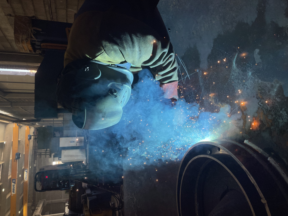 In an industrial workshop located in Tomba, Montenegro, a lone individual is depicted performing welding operations