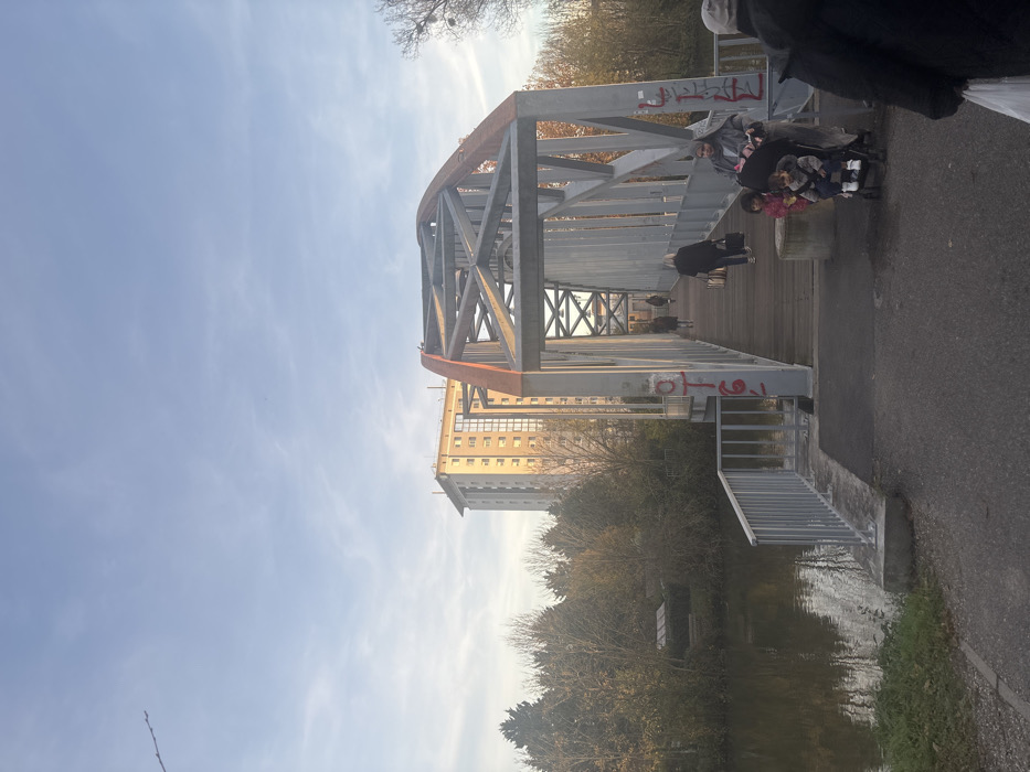 This image captures a pedestrian truss bridge over a waterway in Bischheim, France, under a clear, pale blue sky with scattered cirrus clouds. The bridge, constructed of grey metal trusses, features a prominent red-orange arched frame and a wooden plank deck. Red graffiti, including the letters "OTGL," is visible on the bridge's near-left support beam. In the foreground, an asphalt path leads towards the bridge. On the far right, a person is partially visible, dressed in a dark coat and holding a white bag. Adjacent, a woman wearing a grey headscarf pushes a black stroller containing a child, while another young child walks alongside her. A silver metal railing borders the path on the left, separating it from the dark, calm waterway below. Several individuals are observed walking across the bridge, moving away from the viewer. One woman in a dark coat, carrying a dark bag, is distinctly visible. Beyond the waterway, a dense line of deciduous trees, displaying autumn foliage, lines the bank. In the background, a tall, multi-story building with numerous windows, appearing light brown or beige, stands illuminated by golden sunlight above the trees.