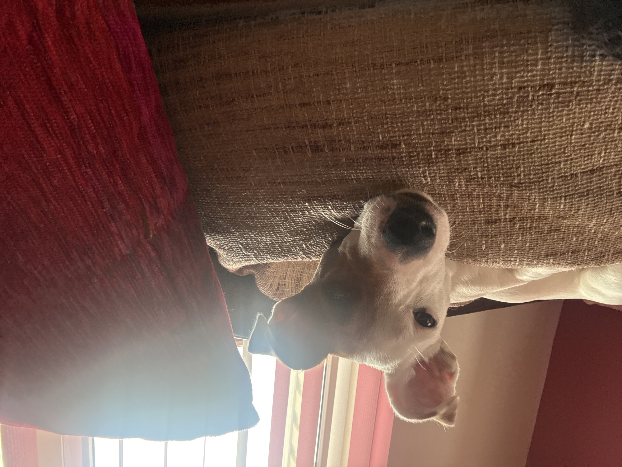 dog upside down, with its head near the bottom center of the frame. The dog has white fur, a black nose, and one visible eye. The background includes a brown textured surface, likely a sofa or chair, and a red fabric item on the left side. In the lower left corner, there is a window with light shining through. The image appears to be taken indoors, but there is no information provided in the image to determine the location in Galabovtsi, Bulgaria.