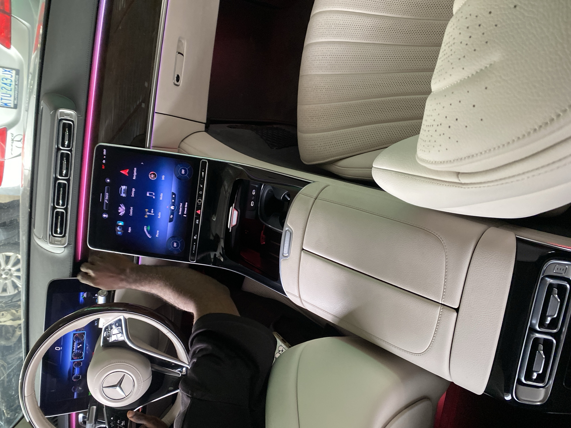 A view from inside a car, presumably in Igboefon, Nigeria, judging by the license plate that reads "KTU-243JX MILLHARBOUR AUTOS". The interior features cream leather seats, a large dashboard screen displaying car controls, and the driver's hands on the steering wheel. The interior also features black trim and illuminated purple accents.