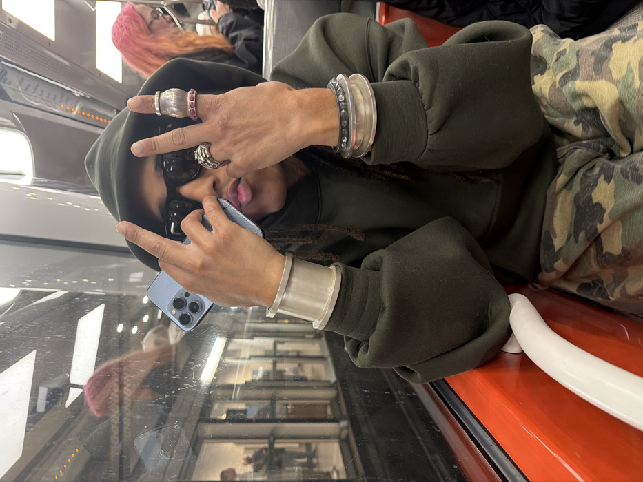 A person is seated on an orange-colored seat inside a modern Paris Métro train, identifiable by its interior design typical of Line 14. The individual wears a dark olive green hooded sweatshirt and camouflage-patterned trousers. Their head is covered by the hood, dark sunglasses obscure their eyes, and dreadlocks are visible. They are holding a light blue iPhone in their left hand, angled towards the camera, while both hands display peace signs with index and middle fingers raised. Their lips are pursed in a slight pout. The person wears multiple silver-toned accessories, including a wide cuff bracelet on the left wrist, several bracelets on the right wrist (one with clear stones), and multiple rings on the right hand, including a large silver-toned ring with red stones on the ring finger. Through the train window, a reflection of a person with pink hair is visible, alongside the illuminated platform of a modern subway station featuring glass barriers and distant figures.
