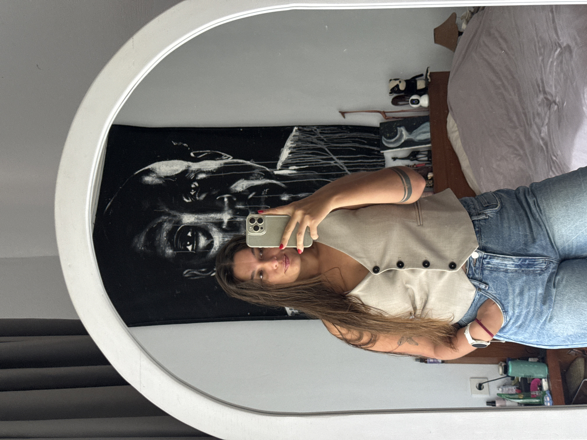 A woman with long brown hair stands facing an oval mirror, holding a smartphone up to take a selfie. She is wearing a tan vest with dark buttons and blue jeans. The reflection in the mirror shows a room with a large bed, a black and white poster on the wall, and various items on a shelf. The location cannot be determined from the image.