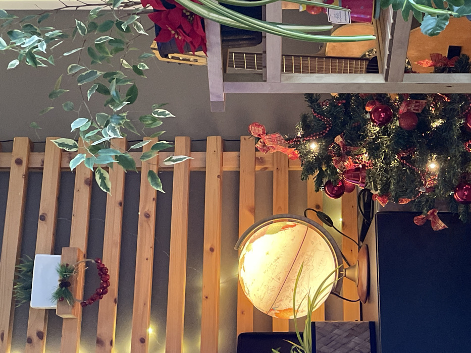This interior image, set in Catania, Italy, displays a festive domestic scene. The background features a wooden slatted wall panel adorned with horizontal strings of warm white fairy lights. Attached to the wall, a small wooden shelf holds a white rectangular planter with green foliage, below which hangs a small wreath-like decoration composed of red berries and minimal greenery. In the mid-ground, a glowing illuminated globe lamp with a visible power cord and inline switch rests on a dark, flat surface. To the left of the globe, a portion of a plant in a woven grey pot is visible. On the right side of the frame, a small, artificial Christmas tree stands, decorated with red spherical ornaments, red ribbons, and strings of red beads, illuminated by numerous small white lights. Partially obscured behind the Christmas tree and to its right, an acoustic guitar is visible, leaning against a surface, its fretboard and headstock discernible. Further right, a light-colored wooden shelving unit is present. Various houseplants are positioned in the right half of the image, including a large plant with variegated green and white leaves in the upper right, a red poinsettia in a dark pot, and another green plant with long, narrow leaves on the shelving unit.