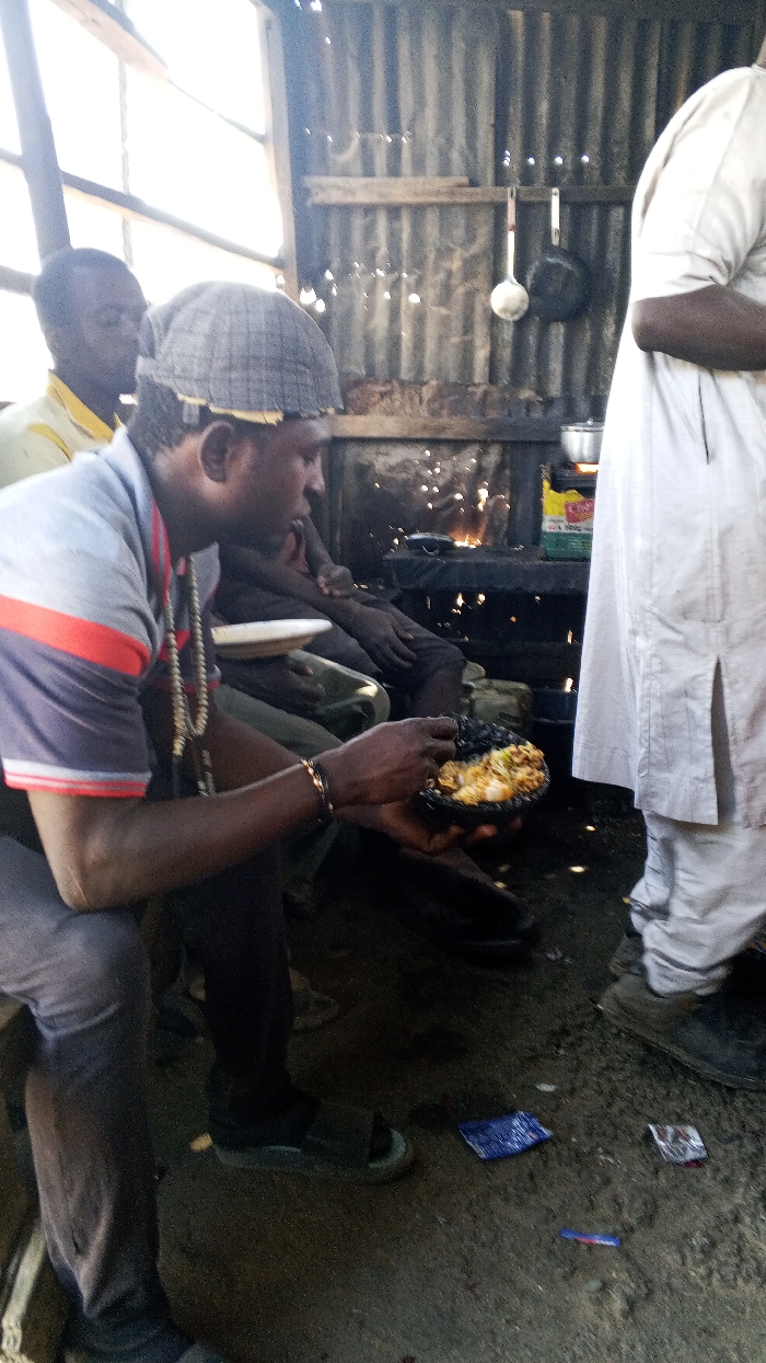 The image depicts an informal eatery or cooking area located in Dakata, Nigeria