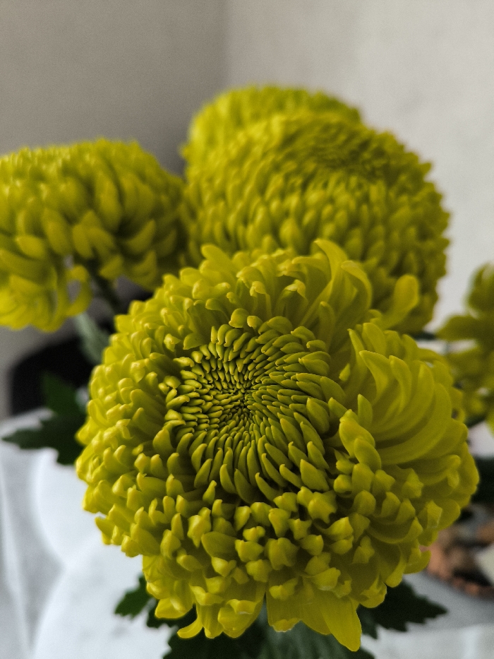 The image displays a close-up of multiple chartreuse-colored chrysanthemums, positioned indoors. The primary subject is a dense, spherical flower in the foreground, in sharp focus, showcasing a spiraling arrangement of numerous small, recurved petals at its center. Two additional, similarly colored chrysanthemums are visible in the soft-focus background, one to the upper left and another to the upper right. Dark green foliage is partially visible beneath and between the flowers. A blurred white object, consistent with a vase or floral wrapping, is present in the lower left, supporting the arrangement. The background consists of an indistinct, uniformly light-toned surface. No individuals are depicted. The specific location within the city of Vinnytsia, Ukraine, cannot be determined from the visual information provided.