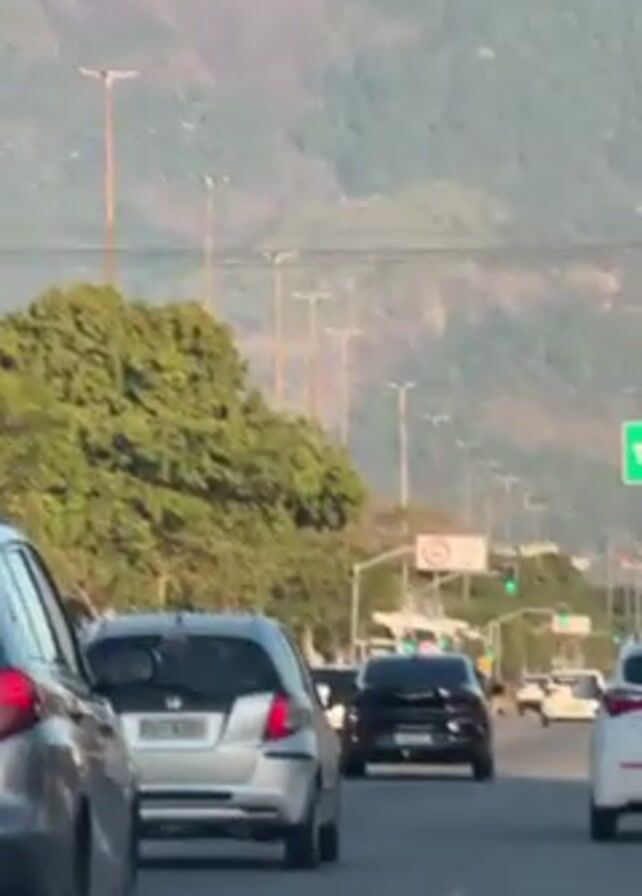 cars stopped in traffic on a road with mountains in the background. There are many streetlights along the road. A green sign indicates the direction of São Conrado, Copacabana, and Centro. All traffic lights are green.