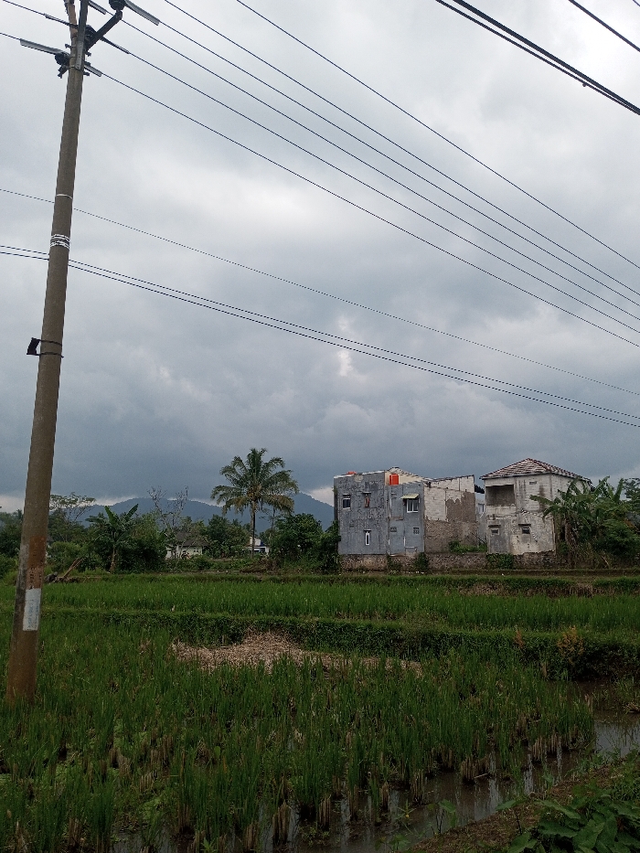 The scene depicts an exterior view in Khajuripada, India, under an overcast sky. A tall, cylindrical concrete utility pole occupies the left foreground, from which multiple black electrical wires extend horizontally across the upper frame. Below the wires, a flooded rice paddy field with visible green rice stalks and cut stubble spans the lower half of the image. In the midground, behind the paddy field, are two structures. The leftmost building is a multi-story, grey, unfinished or weathered concrete structure with multiple rectangular window openings and some red material visible on its roofline. To its right stands another structure, appearing partially constructed or dilapidated, with exposed concrete and a section of a tiled roof. A single palm tree is prominent between these buildings, and other green foliage and smaller trees are scattered throughout the midground. Distant mountains are visible in the background beneath the uniformly grey, cloud-laden sky. No individuals are present in the frame.
