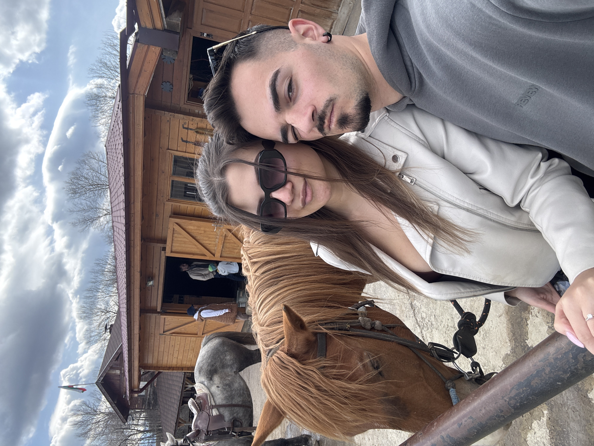 A selfie of a Caucasian male and female couple, leaning their heads together, with horses in the foreground and a barn structure behind, likely taken in Kovachevtsi, Bulgaria. The man, on the right, has short dark hair, a beard, and is wearing a gray hoodie and sunglasses. The woman, on the left, is wearing a white jacket and sunglasses. Two horses are visible in the foreground: a brown horse at the bottom center and a grey horse to the left. Behind them, a wooden barn structure is visible, with two people partially visible inside. A flag is attached to the barn. The sky is partly cloudy. The photo has been rotated counter-clockwise.