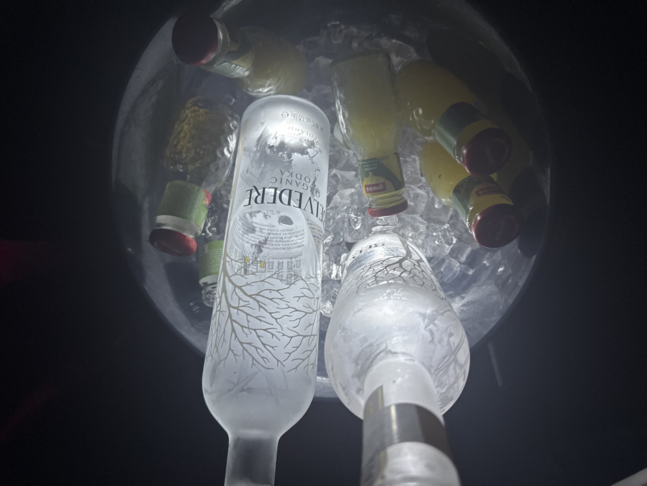 The image presents a top-down view of a translucent ice bucket, located in the city of Paris, France, filled with ice and various chilled beverages. Prominently featured are two frosted glass bottles of Belvedere Organic Vodka; the label of one is clearly visible, depicting a tree motif and architectural elements. Surrounding these larger bottles are multiple smaller bottles containing a yellow liquid, at least five of which are identifiable. One small bottle clearly displays a "Granini" label, with a red cap and green neck wrap, indicating it is likely a fruit juice mixer. The ice cubes are clear and irregularly shaped, surrounding and cooling all bottles. The background is uniformly dark and featureless, suggesting an indoor, low-light environment such as a club or bar. No individuals are visible in the scene, and no active interactions are depicted.