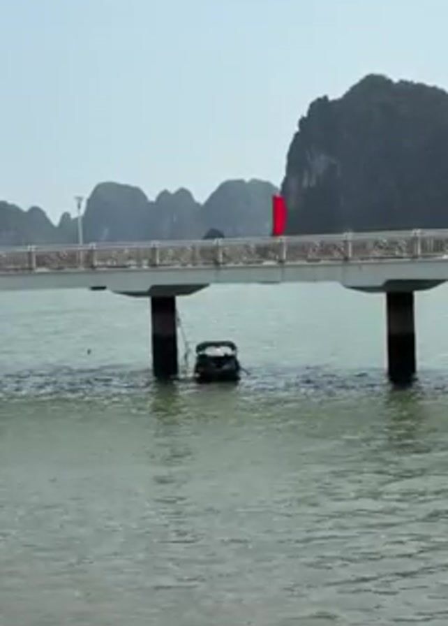 stationary dark-colored boat beneath a white bridge. The bridge spans across the water, supported by several pillars. A red flag is visible on the bridge. Behind the bridge are a series of islands with steep, rocky formations against a light blue sky. The water is slightly choppy.