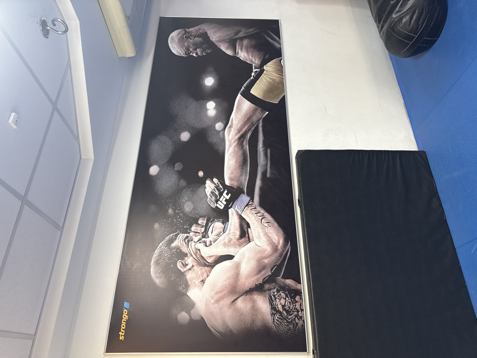 A large poster of two MMA fighters dominates the scene. One fighter has the other in a submission hold. The fighter on top is bald. The fighters wear UFC gloves. The bottom fighter has tattoos. The poster has the "strongo" logo. A black workout mat sits next to the poster. A heavy bag is visible at the top right. The wall is primarily white, with a section of blue visible on the right side. The ceiling has fluorescent lights.