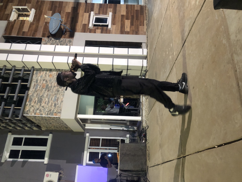 A man in a black outfit performs with a microphone, standing on a concrete surface beside a modern building. A satellite dish is mounted on the building's upper section. The man appears to be in motion, possibly singing or rapping. A small stage with a blue glow and other people can be seen in the background. The scene is likely an outdoor performance or event at night.