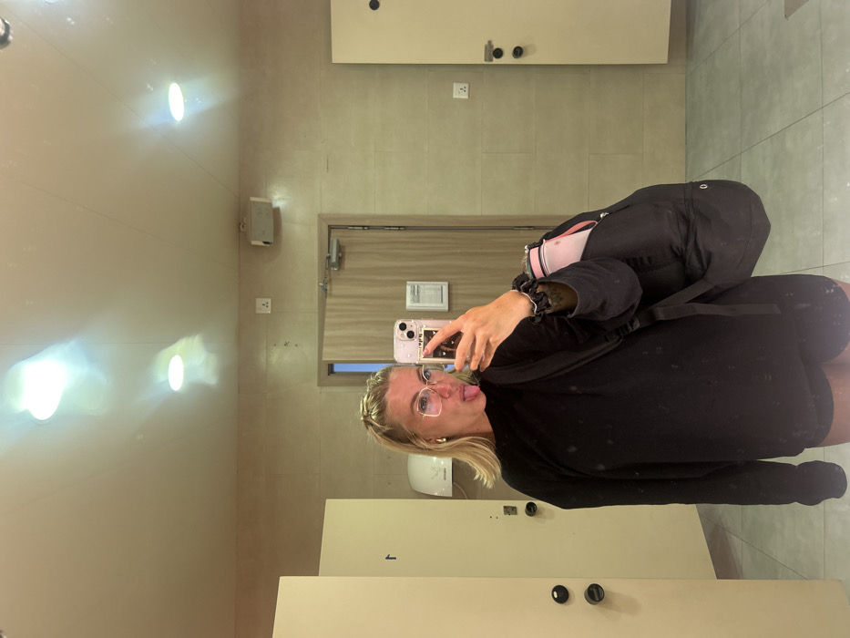 A female subject is depicted in a mirror selfie taken inside a public restroom or changing facility in Malé, Maldives. The subject, a blonde female wearing square-framed glasses, a black long-sleeved top, and black shorts, stands facing the mirror with her tongue extended. She holds a light pink iPhone with a distinctive case in her left hand, positioned to capture her reflection. A black backpack is carried on her right shoulder, with a light pink water bottle protruding from its side pocket. The environment features light beige tiled walls, a light gray tiled floor, and a beige ceiling with circular recessed lights. Visible elements include a white hand dryer mounted on the left wall, a light-colored partition door with a black circular handle on the far left, a wooden door with a metallic door closer mechanism in the center-right background, and another light-colored partition door with a black handle on the far right. White electrical outlets are present on the walls, and a rectangular white fixture is mounted high on the right wall.