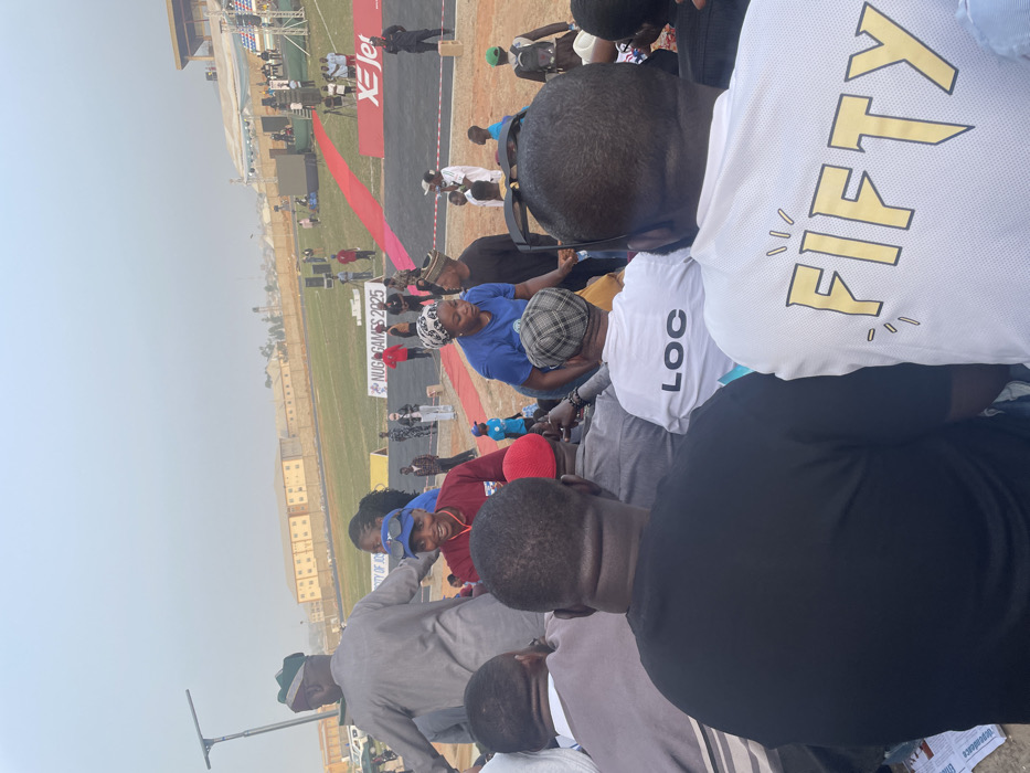 An outdoor event seems to be in progress. Spectators are seated, facing a field with "Nuga Games 2025" banner. The XEJet logo is visible along a black track area. A building is visible in the background. People wearing identifiable shirts with "FIFTY" and "LOC" written on them are among the seated group. The photo is shot from an elevated position.