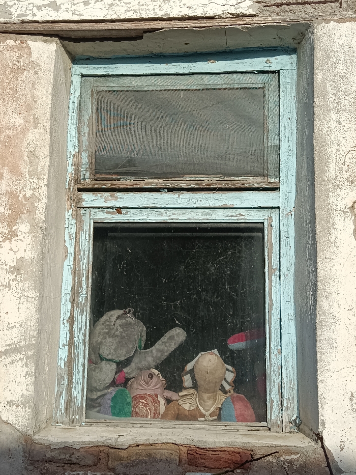 A weathered window frame, painted a faded blue, shows significant chipping and peeling. Behind the dusty glass, a collection of well-worn stuffed animals is visible. They appear huddled together, their colors muted and their forms softened with age. The window is set into a wall with peeling paint. The scene evokes a sense of abandonment and nostalgia.