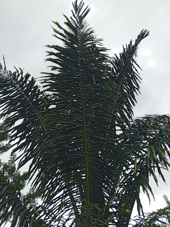 The image presents a low-angle, upward view of a tall, palm-like tree located in the city of Unknown, Unknown. The central subject is characterized by numerous long, dark green pinnate fronds, each comprising multiple slender leaflets. These fronds extend from a central, vertical stalk or trunk, which is visible through the dense foliage. Many leaflets display a textured surface and some appear to have slightly frayed or discolored tips and edges. Lighter green plant growth is observed attached to the central stalk in the lower portion of the frame. In the lower-left quadrant, a mass of denser, lighter green foliage from another tree or shrub is partially visible. The background consists of a uniformly light grey, overcast sky, indicating diffused light conditions. No human subjects, animals, or man-made objects are present. No specific actions or interactions are depicted. The environment is arboreal.