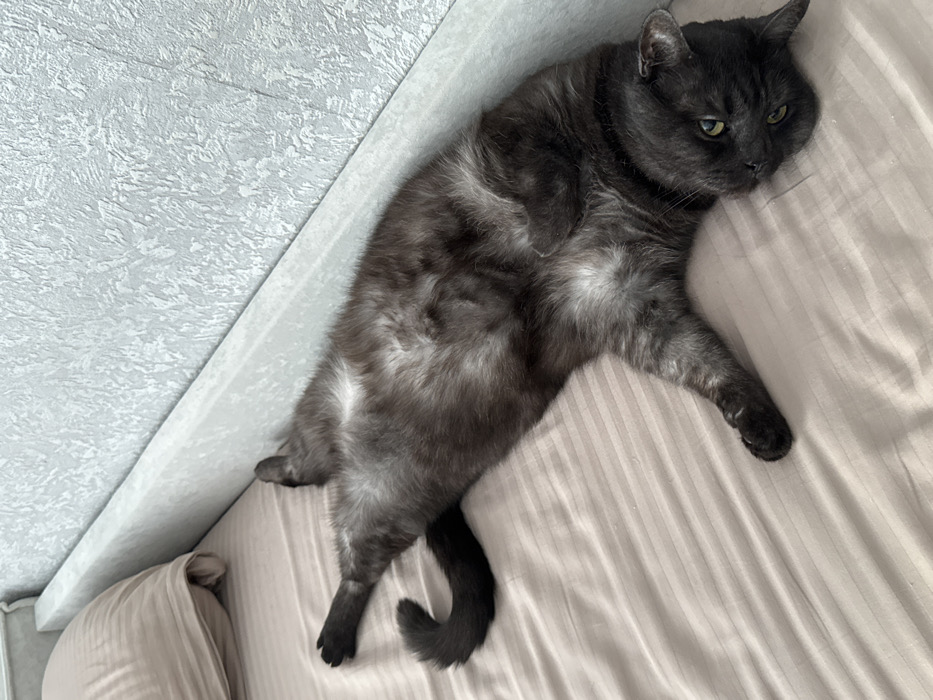 - "A gray cat with a mottled coat lies on a striped beige bed sheet" by FM-Xm2Zk1, licensed under CC BY 4.0